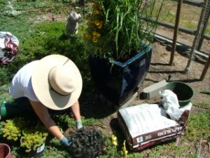 When planting the pot start at the middle and work out. Put some potting soil in the pot and then set your focal point in the container, checking where the finished level of the plant will be. All plants should end up one to two inches below the lip of the pot. Add soil under the plants, and between them, till all plants are at the desired level. I use my fingers and really push the soil down under the plants, and around them, making sure that there are no air pockets or unfilled gaps between the plants. Then water well with a watering can, or a hose with a nozzle that allows for a soft spray. Check the soil level again and add some if necessary.